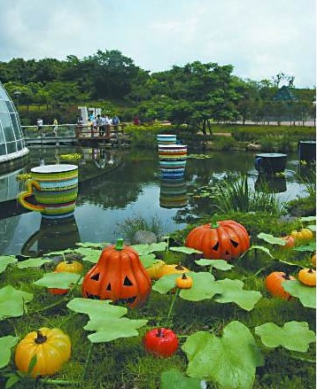 室內(nèi)館的中央是綠色的巨型豆莖,來自童話《杰克與豆莖》。此外這里還分主題展示著濟州島的守護神石爺爺、大型交響音樂會的宏大場面、五彩斑斕的歐洲村落、美麗的海底世界、色彩絢麗的鳥兒群棲在樹梢。