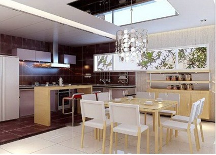 一般開(kāi)放式廚房是指非封閉式的廚房隔間,也就是廚房空間與餐廳合二為一或與客廳空間相鄰而無(wú)任何門(mén)擋住的空間。開(kāi)放式廚房在增大室內(nèi)空間的同時(shí),在使用過(guò)程中也帶來(lái)了不少的麻煩:首先,開(kāi)放式廚房容易將油煙釋放出來(lái),每日的三餐油煙,需要主婦們更加勤勞;其次,開(kāi)放式的廚房空間要求與家裝整體風(fēng)格相統(tǒng)一,否則就會(huì)產(chǎn)生整體家裝風(fēng)格的不和諧。