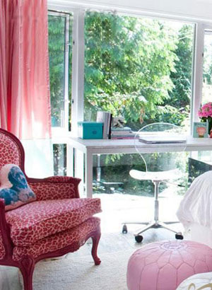 5、一款古典的扶手椅被漆上了漂亮的紅色油漆,并且用動(dòng)物斑紋來(lái)裝飾,給這個(gè)女孩房增添了生動(dòng)的色彩。