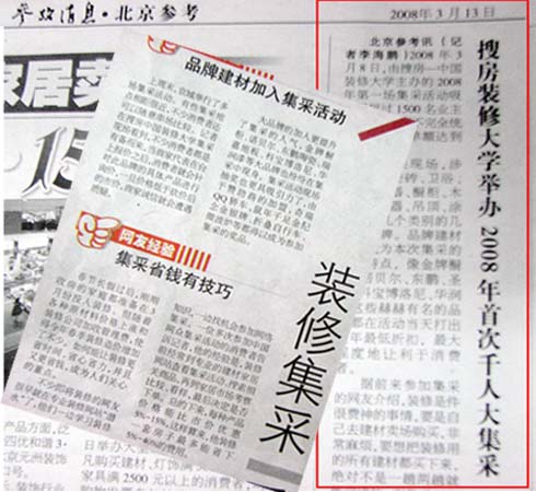 2008年3月,首創(chuàng)、并且越做越大的搜房網(wǎng)家居建材大集采再度以空前的規(guī)模和盛況上演了一場(chǎng)“饕餮盛宴”。除了規(guī)模、參與商家、成交金額等創(chuàng)造了史無前例的記錄外,全國(guó)近50家電視、報(bào)紙、網(wǎng)絡(luò)等眾多媒體的關(guān)注和報(bào)道也成為一大熱點(diǎn)現(xiàn)象。 裝飾裝修