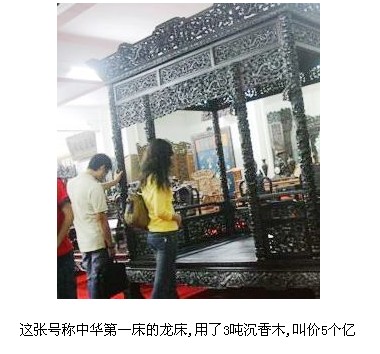 他把這張長2.2米、寬1.8米、高2.4米的龍床稱為“中華第一床”,理由是國內(nèi)目前唯一的皇宮御用床、原料都是海內(nèi)外罕見的大料,雕工也是一流的……