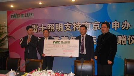 11月7日,國內(nèi)照明行業(yè)領(lǐng)軍企業(yè)雷士照明向南京2014年第二屆夏季青年奧運會申辦委員會捐贈200萬元,支持南京的申辦行動。這是自2007年8月南京代表中國申辦青年奧運會夏季運動會以來接收的第一筆社會捐贈,同時也意味著南京申辦青奧會進入沖刺階段。