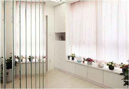 過道,白色壁柜,多彩條紋窗簾,搭配在寬大的落地窗前,壁柜擺放五顏六色的小盆栽俏皮可愛,可為房間增添一種年輕活潑感。