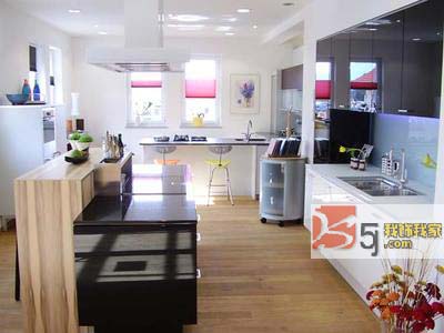 如果把廚房做成局部開放,只有一個窗臺大小的位置和餐廳相通的話,這樣的油煙比較好處理,炒菜時可以用玻璃、簾子或者其他東西遮擋一下,等做飯完畢油煙排干凈再把擋板拿開,也是一種方法。 上海裝潢網(wǎng)