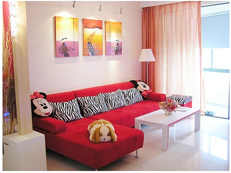 典雅色系:中心色為粉紅色。沙發(fā)、燈罩用粉紅色。窗簾、靠墊用粉紅色印花布,地板淡茶色。墻用奶白色,此色系適宜年輕女性住房用。