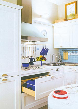 白漆櫥柜令小廚房充滿了明亮印象,人造石臺面與櫥柜渾然一體,品質(zhì)感絲毫不減。在與壁柜相接的空白墻面上,天藍(lán)色玻璃馬賽克令流動(dòng)的視覺產(chǎn)生出美妙的變化。所有的餐廚用具都以藍(lán)色、白色和金屬色為主,統(tǒng)一的色彩使小廚房里沒有任何的雜亂。
