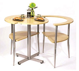 椅子與圓桌的組合是再普通不過的了,可即便是這樣,常見的家具依然可以變成很有創(chuàng)意的產(chǎn)品。這款情侶餐桌的設(shè)計(jì)就非常新穎,將兩把椅子與餐桌完美地結(jié)合在了一起。椅子的靠背上方被設(shè)計(jì)成了半環(huán)形,這樣兩個(gè)椅子就剛好可以將餐桌包圍起來。椅子與桌面拼起來時(shí),看上去就是一個(gè)普通的圓桌。需要時(shí),只須將“外環(huán)”拉開,即可與你的愛人面對面地一同進(jìn)餐了,多溫馨浪漫啊.